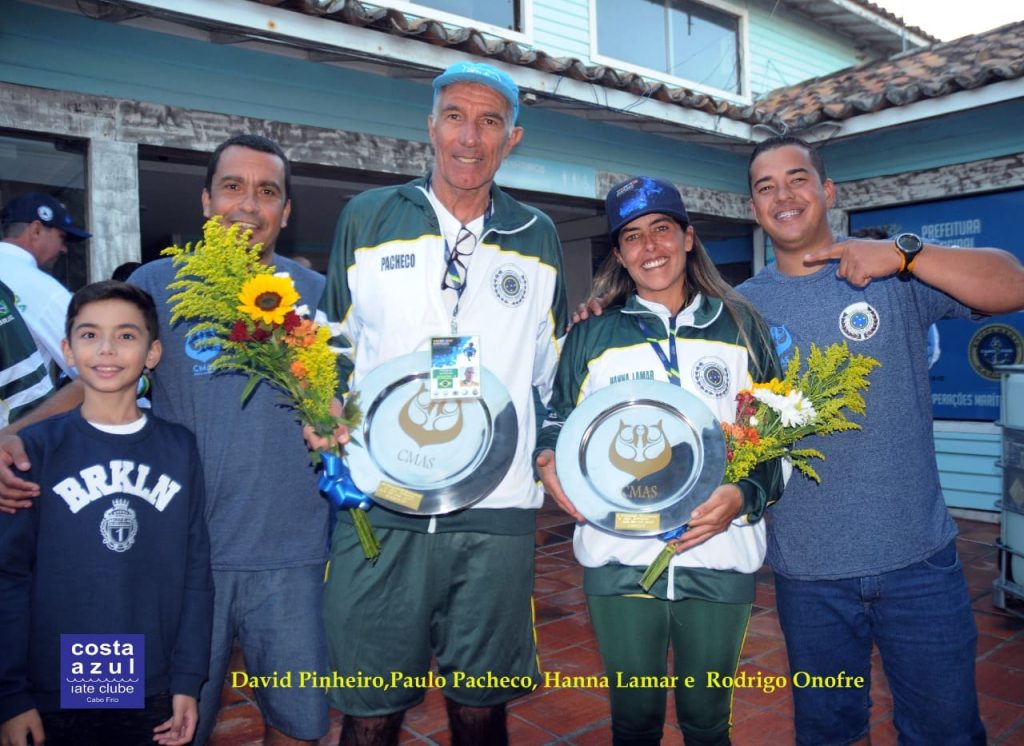Os mergulhadores David Pinheiro, Paulo Pacheco, Hanna Lamar e Rodrigo Onofre posam após Brasil conquistar o título do VIII PanAmericano de Pesca-Sub realizado em Cabo Frio este ano. Paulo Pacheco já vestiu a camisa do Costa Azul em outras competições e também saiu vitorioso. Hanna defende outro clube. A dupla David Pinheiro e Rodrigo continuam com o Costa Azul e já estão inscritos em diversos torneios para 2023.
